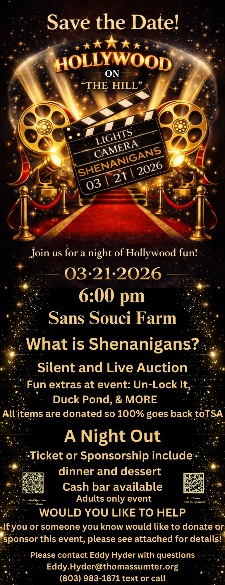 Shenanigans is TSA's highly anticipated annual silent and live auction fundraiser. This exciting event features an evening of great food, fun games, and incredible prizes up for bidding. Held at the picturesque Sans Souci Farms, Shenanigans offers a wonderful opportunity to gather with friends for an unforgettable night.